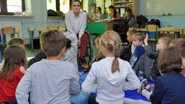 Dzieci rozmawiają z prowadzącymi, nieskrępowane zadają pytania, a na koniec zajęć pod okiem artystki wymyślają, jak można zaprojektować ich szkołę, tak by była dostępna dla wszystkich. Tworzą prace zainspirowane spotkaniem.